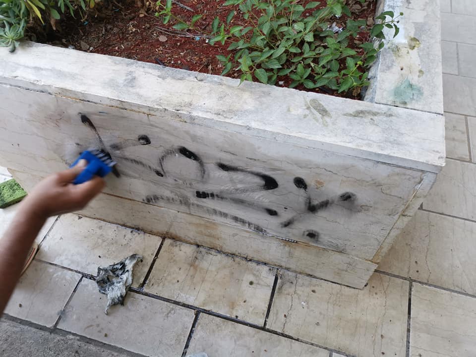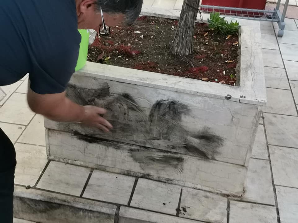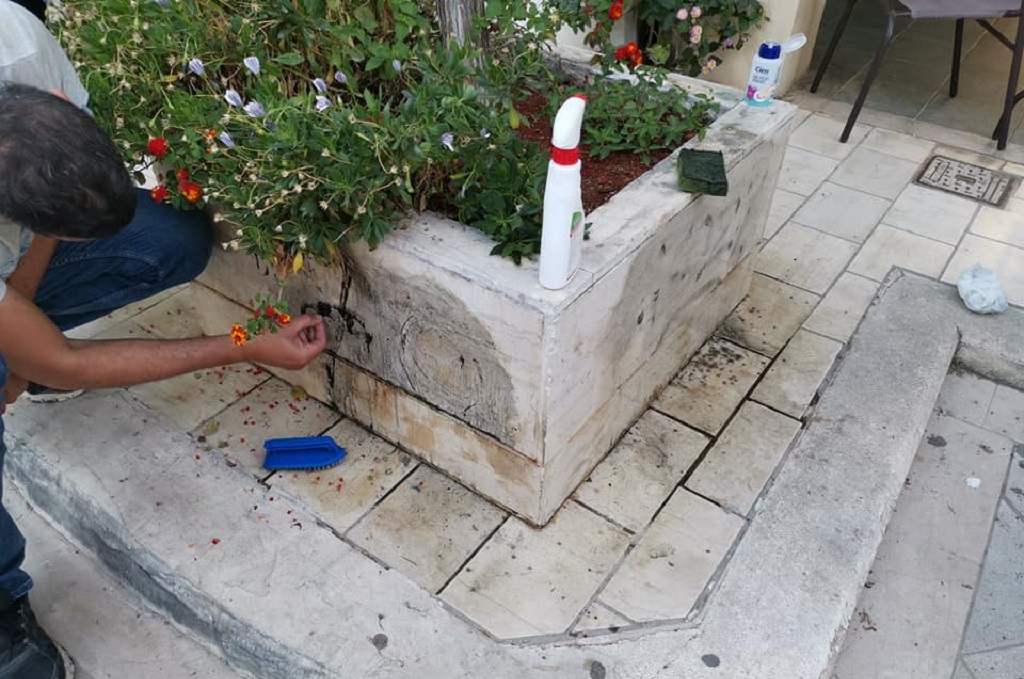 Έτσι, με χορηγία στην Ομάδα ειδικού σπρέι αντιγκράφιτι και μετά από καλό τρίψιμο, έλαμψε και πάλι το μάρμαρο, κοντά στο οποίο έχουν τοποθετηθεί τα δέντρα και τα λουλούδια (όπου υπάρχουν), με την ελπίδα να παραμείνουν καλαίσθητα και καθαρά και οι επιχειρηματίες να φυτέψουν και να περιποιούνται αυτά τα παρτέρια.