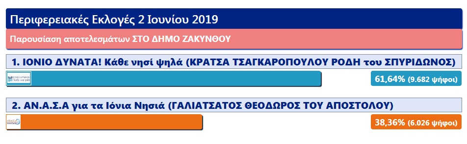 Σε ότι αφορά την Π.Ε. Ζακύνθου και εδώ η Ρόδη Κράτσα πήρε εύκολη νίκη έχοντας συγκεντρώσει 9.682 ψήφους και ποσοστό 61,64% έναντι 6.026 ψήφους και ποσοστό 38,36% του κ. Γαλιατσάτου