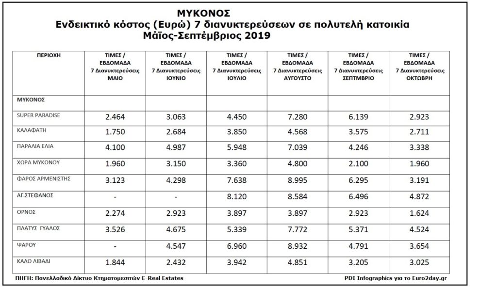 Ενδεικτικό του χάσματος τιμών είναι το γεγονός πως το κόστος διαμονής για μια βδομάδα (7 διανυκτερεύσεις) διαμορφώνεται στα επίπεδα των 9.000-10.000 σε βίλες στη Μύκονο και Σαντορίνη τον Αύγουστο και είναι οκταπλάσιες από νησιά όπως η Ρόδος, πενταπλάσιες από προορισμούς όπως η Τήνος, η Σκόπελος, η Ζάκυνθο ή η Λευκάδα και τετραπλάσιες από περιοχές όπως η Σκιάθος ή η Αλόννησος.