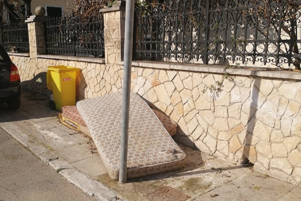 Χθες το πρωί εντοπίσαμε όχι ένα, όχι δύο αλλά τρία στρώματα ΑΚΡΙΒΩΣ ΕΞΩ από την Εκκλησία του Αγίου Διονυσίου και όχι έξω από μεγάλο κάδο, αλλά από έναν μικρό κάδο απορριμμάτων που βρίσκεται πάνω στο πεζοδρόμιο.