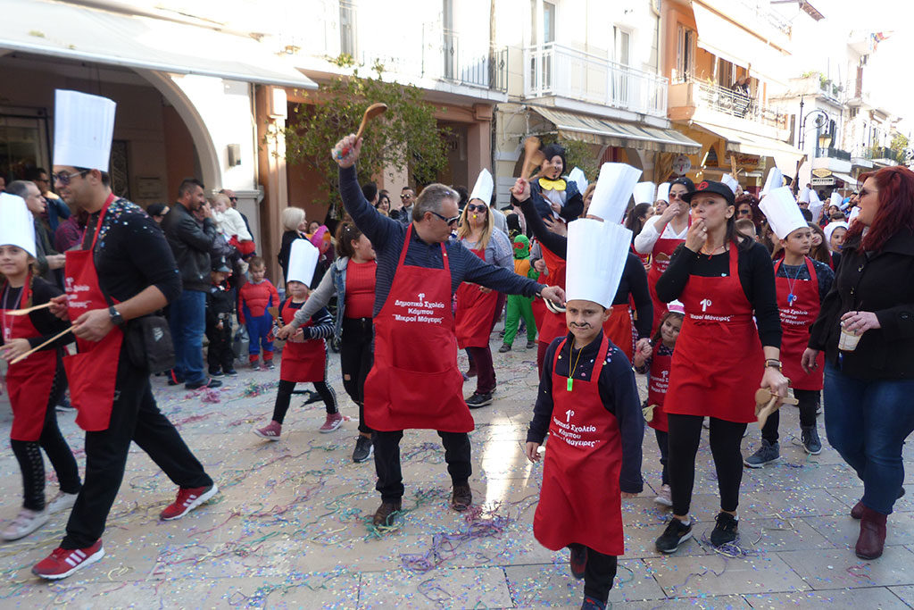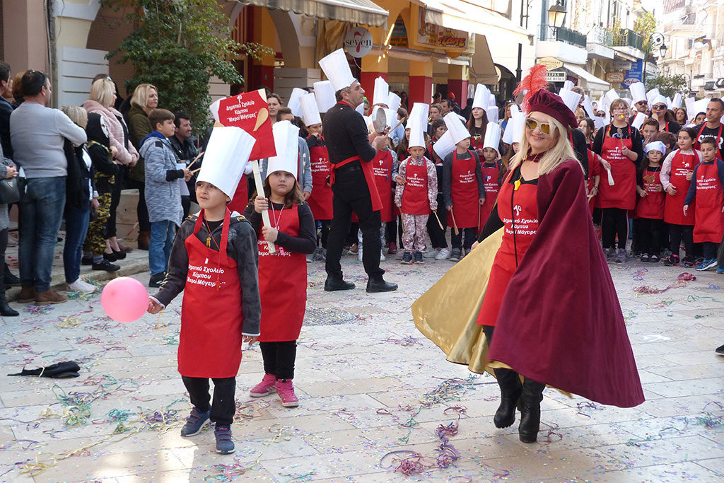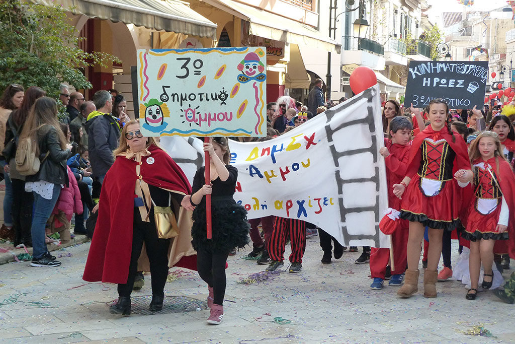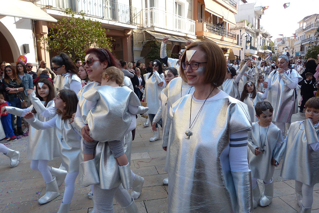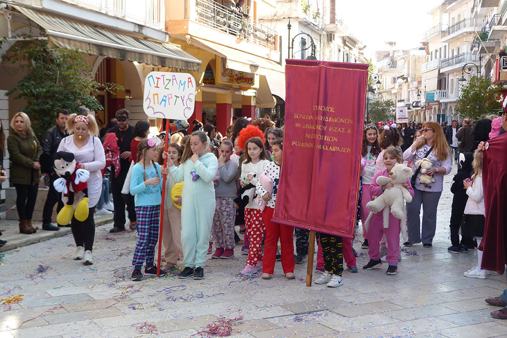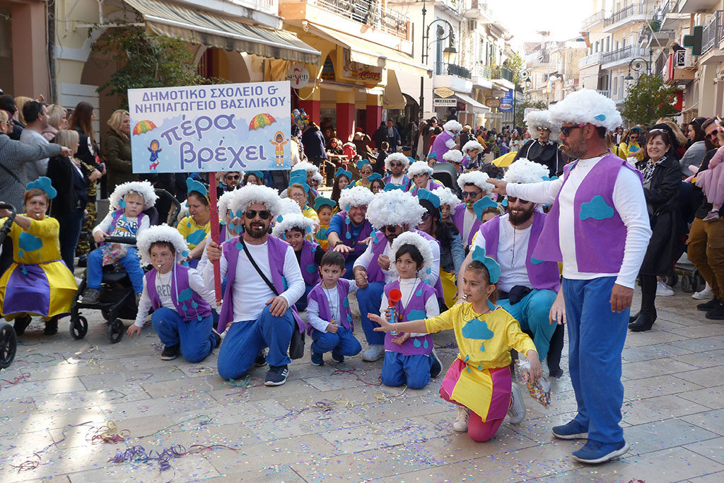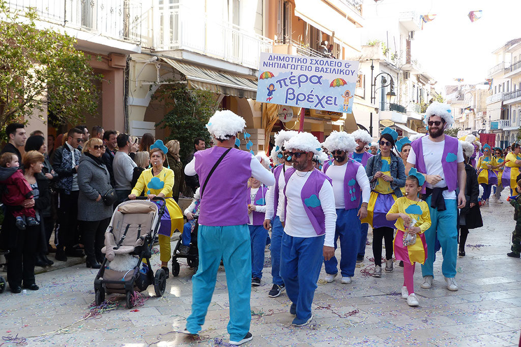 Πρώτο παρέλασε το 1ο Δημοτικό Σχολείο που μας ταξίδεψε στο διάστημα με το γκρουπ «Διαστημάνθρωποι» και ακολούθησε το 2ο Δημοτικό και Νηπιαγωγείο με τις ευφάνταστες στολές και τίτλο του γκρουπ «Ήλιε μου, Φεγγάρι μου». Σειρά είχε το 3ο Δημοτικό με και Νηπιαγωγείο με το γκρουπ «cinema heroes» όπου παιδιά και μεγάλοι διάλεξαν στολές από ήρωες του σινεμά , το 4ο Δημοτικό με τους «μικρούς και μεγάλους νάνους» που κέρδισαν τις εντυπώσεις και τα φωτογραφικά κλικ , το 5ο Δημοτικό και Νηπιαγωγείο με τις όμορφες στολές τους με το “Halloween party”, το Δημοτικό Σχολείο Βασιλικού με το γκρουπ «Πέρα Βρέχει» και τις πρωτότυπες στολές και περούκες, το 7ο Δημοτικό και Νηπιαγωγείο της Ρίζας με την έξυπνη ιδέα να φορέσουν τις πιτζάμες και να συμμετέχουν σε έναν «πιτζαμοπόλεμο» , το 2ο Δημοτικό της Ρίζας που μας θύμισε τη ζακυνθινή παράδοση με τα ντόμινο, το 3ο Δημοτικό Ρίζας μαζί με τον Πολιτιστικό Σύλλογο Καλλιθέας το Κούκεσι που με το γκρουπ «Μπατιρ όιλ» πέρασαν ένα «ηχηρό» μήνυμα για τους κίνδυνους των εξορύξεων στο Ιόνιο, το Δημοτικό Παντοκράτορα με τις πανέμορφες στολές «Γιαπωνέζες, Γκέισες και Σαμουράι» το Δημοτικό Μουζακίου με τα εμπνευσμένα από την σύγχρονη «διαδικτυακή» ζωή μας «τα emoji εν δράσει» και τέλος το 1ο Δημοτικό Κάμπου που μας άνοιξε την όρεξη με τους μάγειρες.