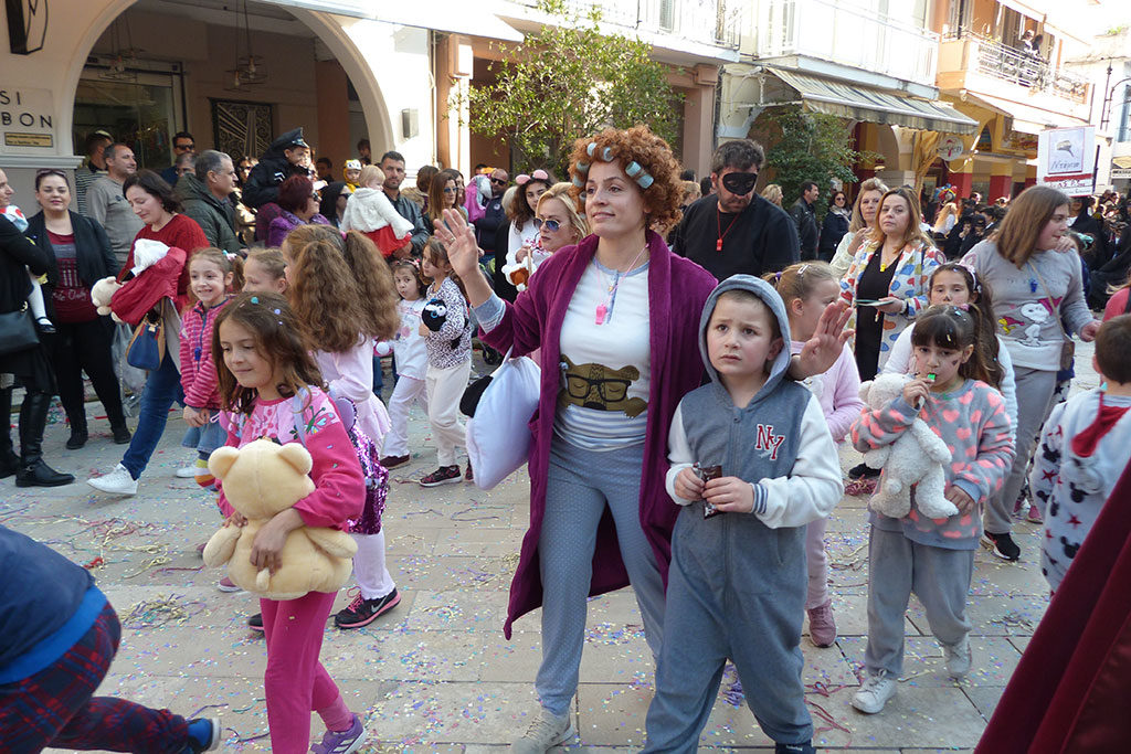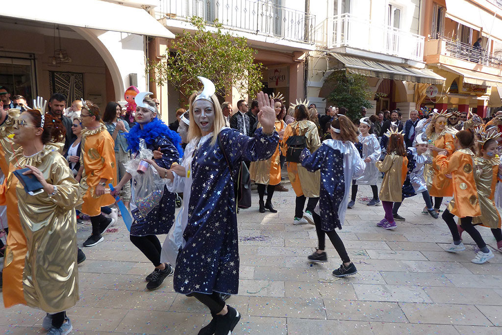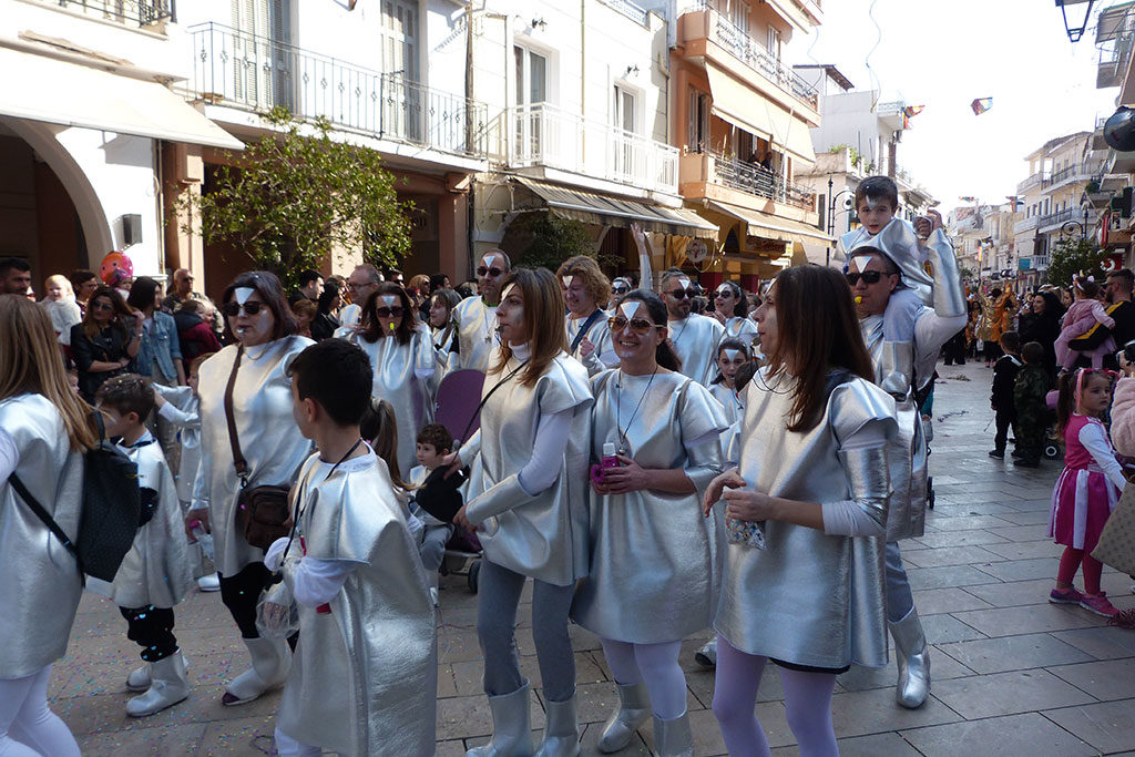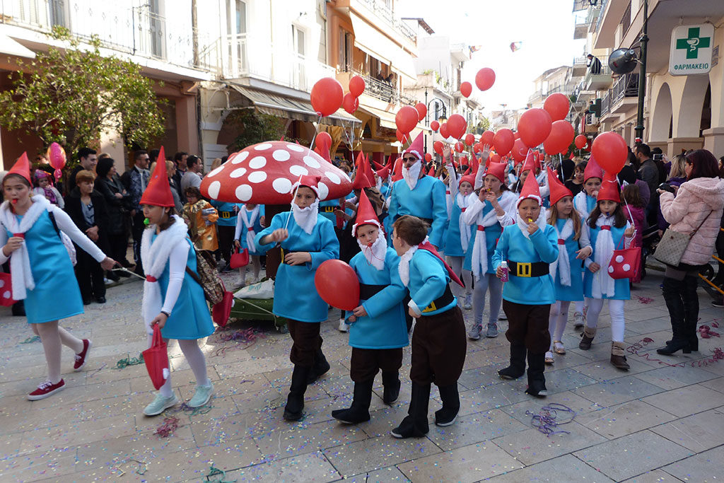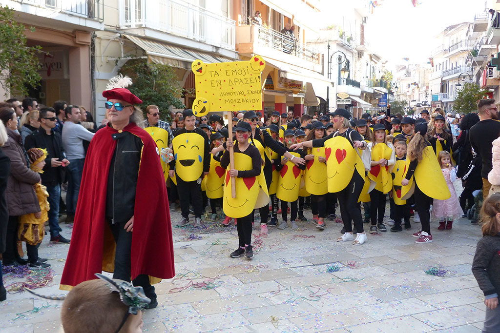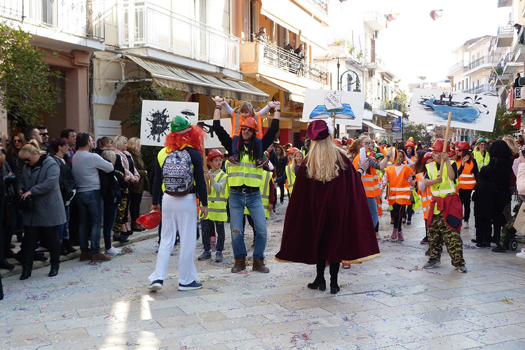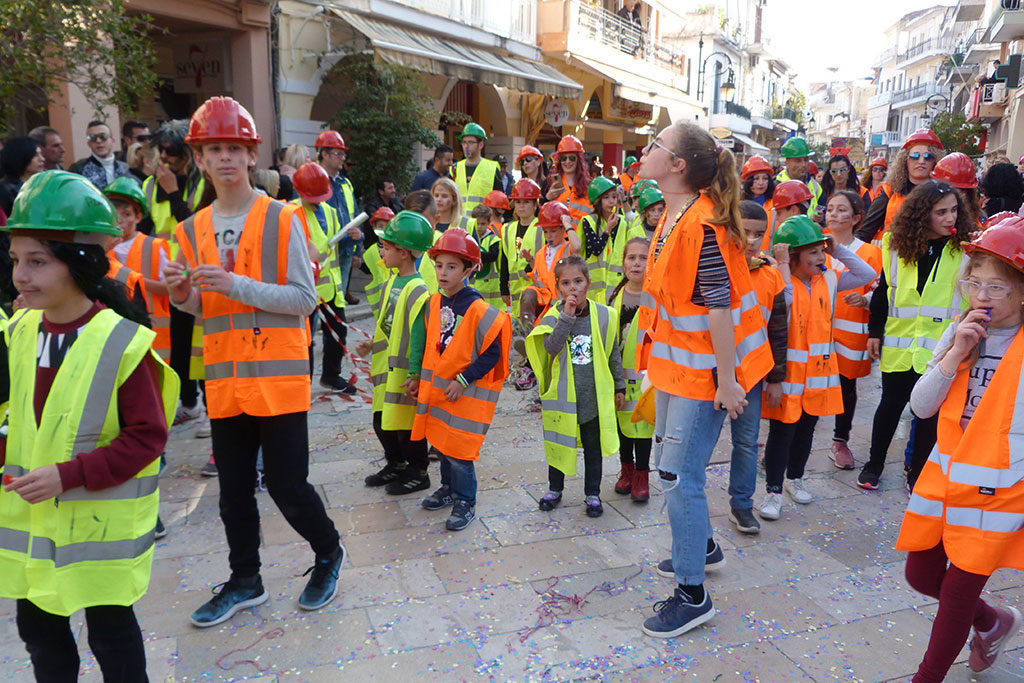 Πρώτο παρέλασε το 1ο Δημοτικό Σχολείο που μας ταξίδεψε στο διάστημα με το γκρουπ «Διαστημάνθρωποι» και ακολούθησε το 2ο Δημοτικό και Νηπιαγωγείο με τις ευφάνταστες στολές και τίτλο του γκρουπ «Ήλιε μου, Φεγγάρι μου». Σειρά είχε το 3ο Δημοτικό με και Νηπιαγωγείο με το γκρουπ «cinema heroes» όπου παιδιά και μεγάλοι διάλεξαν στολές από ήρωες του σινεμά , το 4ο Δημοτικό με τους «μικρούς και μεγάλους νάνους» που κέρδισαν τις εντυπώσεις και τα φωτογραφικά κλικ , το 5ο Δημοτικό και Νηπιαγωγείο με τις όμορφες στολές τους με το “Halloween party”, το Δημοτικό Σχολείο Βασιλικού με το γκρουπ «Πέρα Βρέχει» και τις πρωτότυπες στολές και περούκες, το 7ο Δημοτικό και Νηπιαγωγείο της Ρίζας με την έξυπνη ιδέα να φορέσουν τις πιτζάμες και να συμμετέχουν σε έναν «πιτζαμοπόλεμο» , το 2ο Δημοτικό της Ρίζας που μας θύμισε τη ζακυνθινή παράδοση με τα ντόμινο, το 3ο Δημοτικό Ρίζας μαζί με τον Πολιτιστικό Σύλλογο Καλλιθέας το Κούκεσι που με το γκρουπ «Μπατιρ όιλ» πέρασαν ένα «ηχηρό» μήνυμα για τους κίνδυνους των εξορύξεων στο Ιόνιο, το Δημοτικό Παντοκράτορα με τις πανέμορφες στολές «Γιαπωνέζες, Γκέισες και Σαμουράι» το Δημοτικό Μουζακίου με τα εμπνευσμένα από την σύγχρονη «διαδικτυακή» ζωή μας «τα emoji εν δράσει» και τέλος το 1ο Δημοτικό Κάμπου που μας άνοιξε την όρεξη με τους μάγειρες.