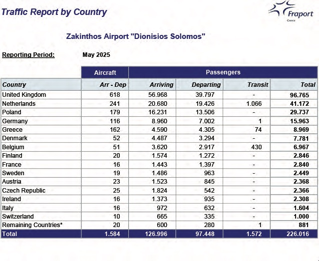 Ως προς την εθνικότητα των τουριστών που αφίχθησαν επί συνολικού αριθμού 226.016 επιβατών, οι 96.765 προέρχονται από την Μεγάλη Βρετανία και ακολουθούν 41.172 από την Ολλανδία και 29.737 από την Πολωνία. Οι υπόλοιποι προέρχονται από άλλες ευρωπαϊκές χώρες.