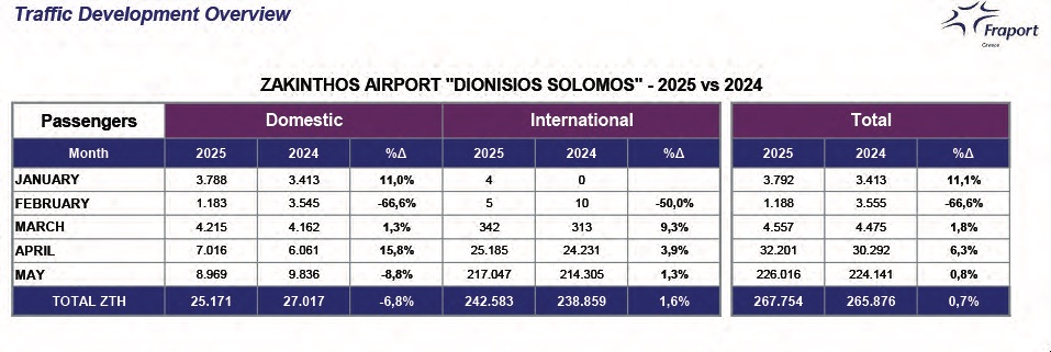 Οριακή αύξηση 1,3% σημείωσαν οι αφίξεις αλλοδαπών τουριστών στο διεθνές αεροδρόμιο Ζακυνθου το μήνα Μάϊο σε σύγκριση με τον ίδιο μήνα του 2024. Αυτό ανακοίνωσε χθες η εταιρείας Fraport Hellas.