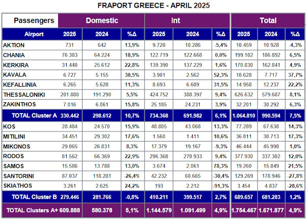 Το σύνολο των επιβατών που διακινήθηκαν στα 14 αεροδρόμια ανέρχεται τον Απρίλιο σε 1,75 εκατ. έναντι 1,67 εκατ. πέρυσι, ενώ οι επιβάτες τετραμήνου ανήλθαν σε 3,9 εκατ. έναντι 3,76 εκατ. το α’ 4μηνο του 2024.