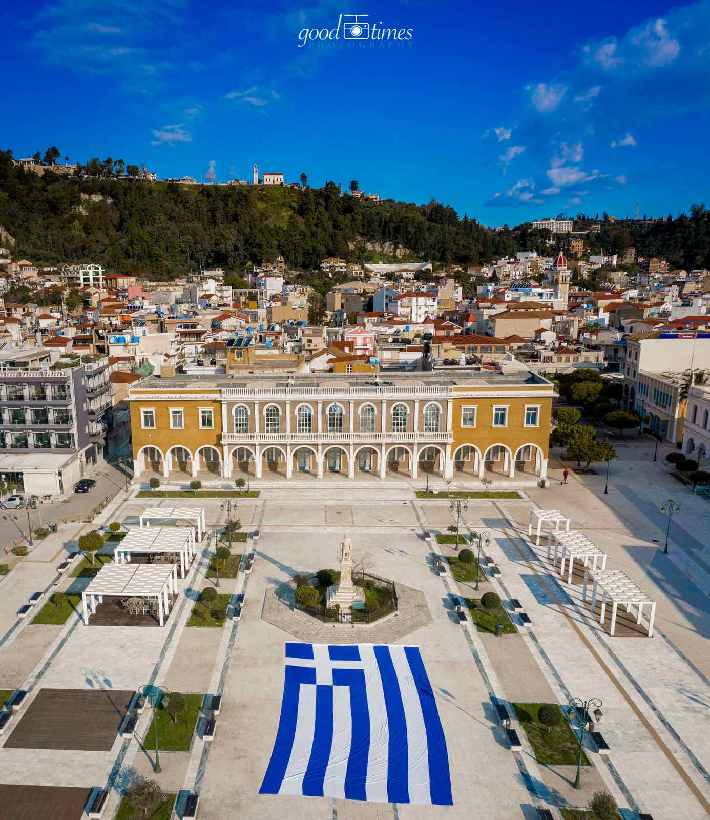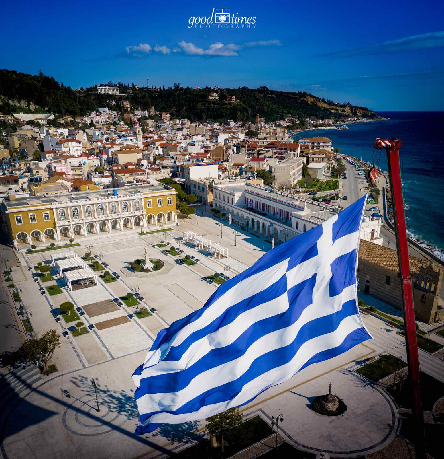 Ο φακός του “Goodtimes Photography” του Διονύση Παπαντώνη, για άλλη μια φορά κατέγραψε μοναδικές εικόνες, με την πανέμορφη Γαλανόλευκη να κυματίζει στον ουρανό της Ζακύνθου, μπροστά από το άγαλμα του Εθνικού μας ποιητή Διονυσίου Σολωμού.