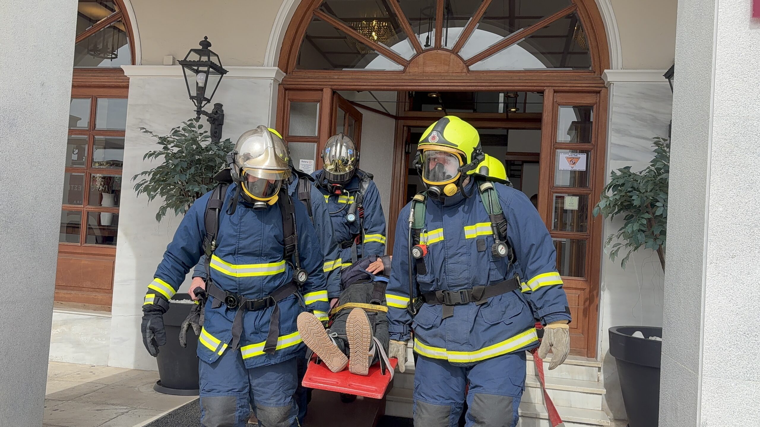 Περίπου στις 10:30 το πρωί ξεκίνησε το βασικό σενάριο της άσκησης. Τα πρώτα πυροσβεστικά οχήματα έφτασαν έξω από το ξενοδοχείο, ενώ άνδρες της Πυροσβεστικής εισήλθαν άμεσα στο εσωτερικό του κτιρίου, επιχειρώντας σε πραγματικές συνθήκες χώρου και χρόνου, όπως θα συνέβαινε σε ένα αληθινό περιστατικό.