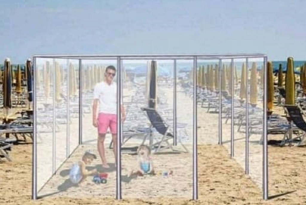 Ο λόγος για μια εταιρεία από τη Μόντενα, η οποία προτείνει ατελείωτες σειρές από ομπρελοξαπλώστρες πάνω στην άμμο, μέσα σε ασκεπή… κουτιά από πλέξιγκλας, όπου θα χωράει ένα ζευγάρι Ιταλών -άντε, το πολύ μια ολιγομελής οικογένεια- προστατευμένοι από τους… ιούς και τα μικρόβια των διπλανών τους.