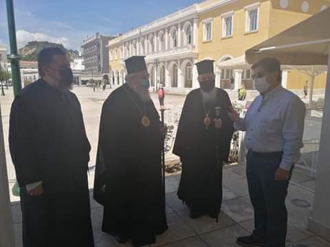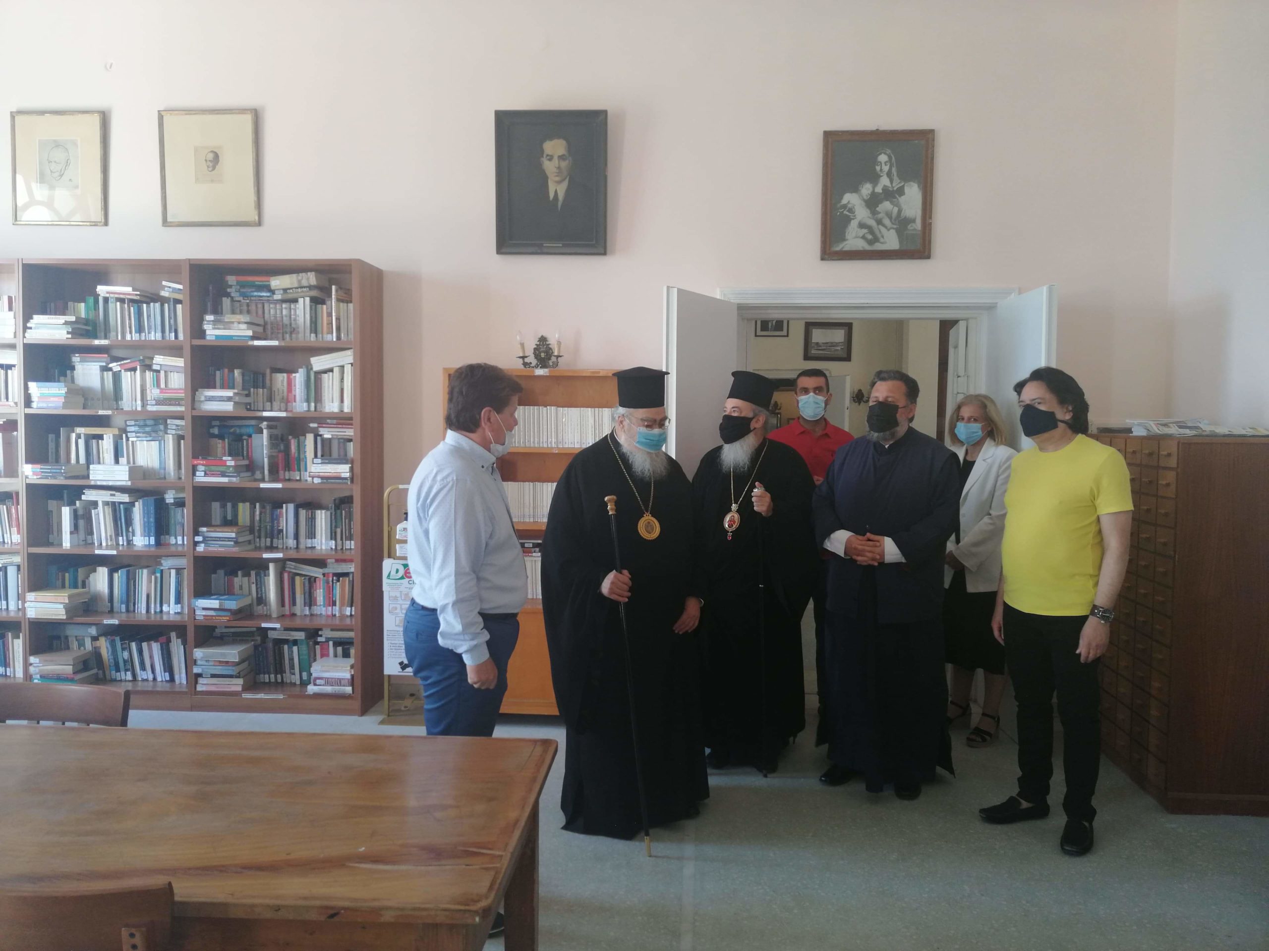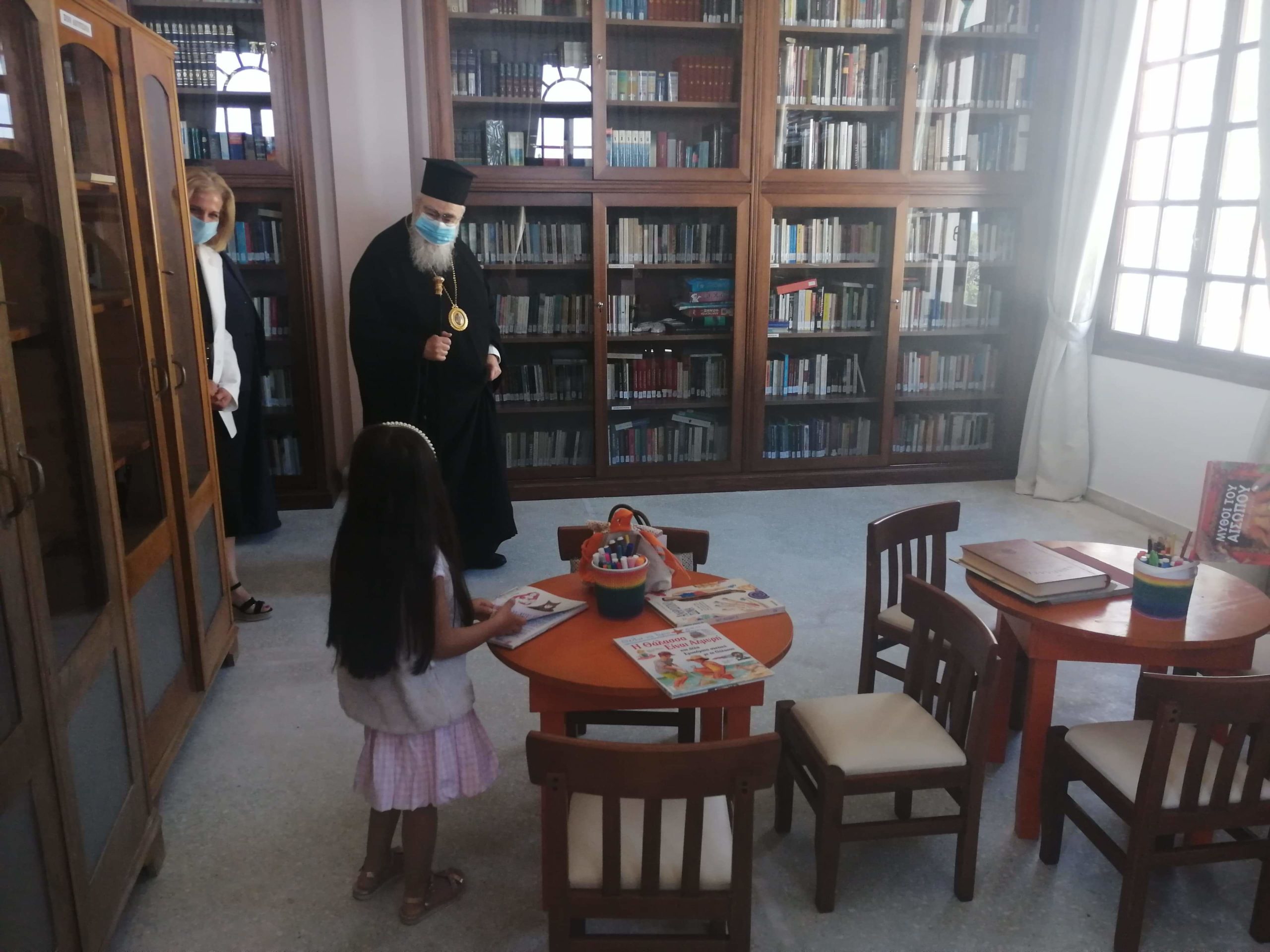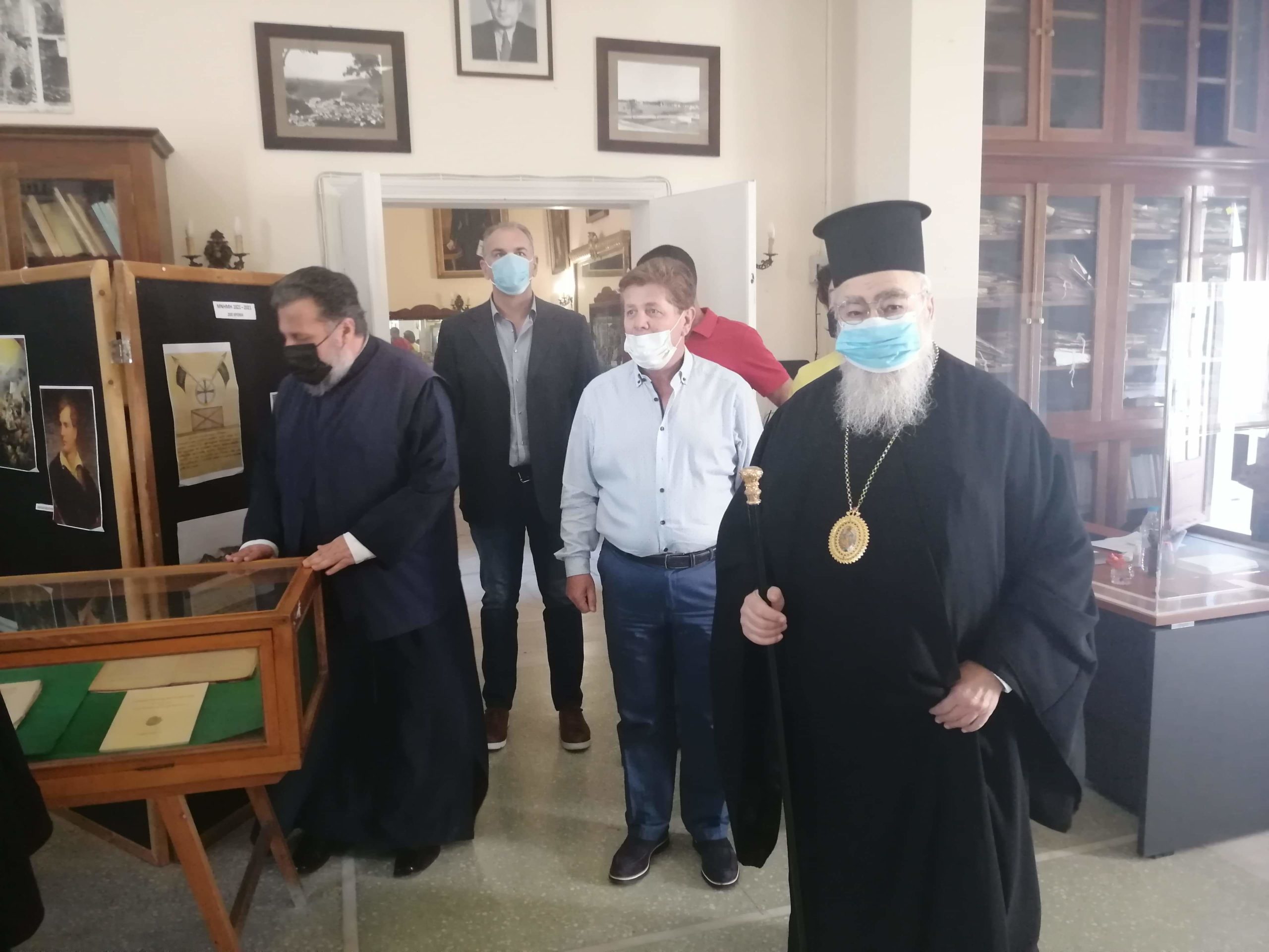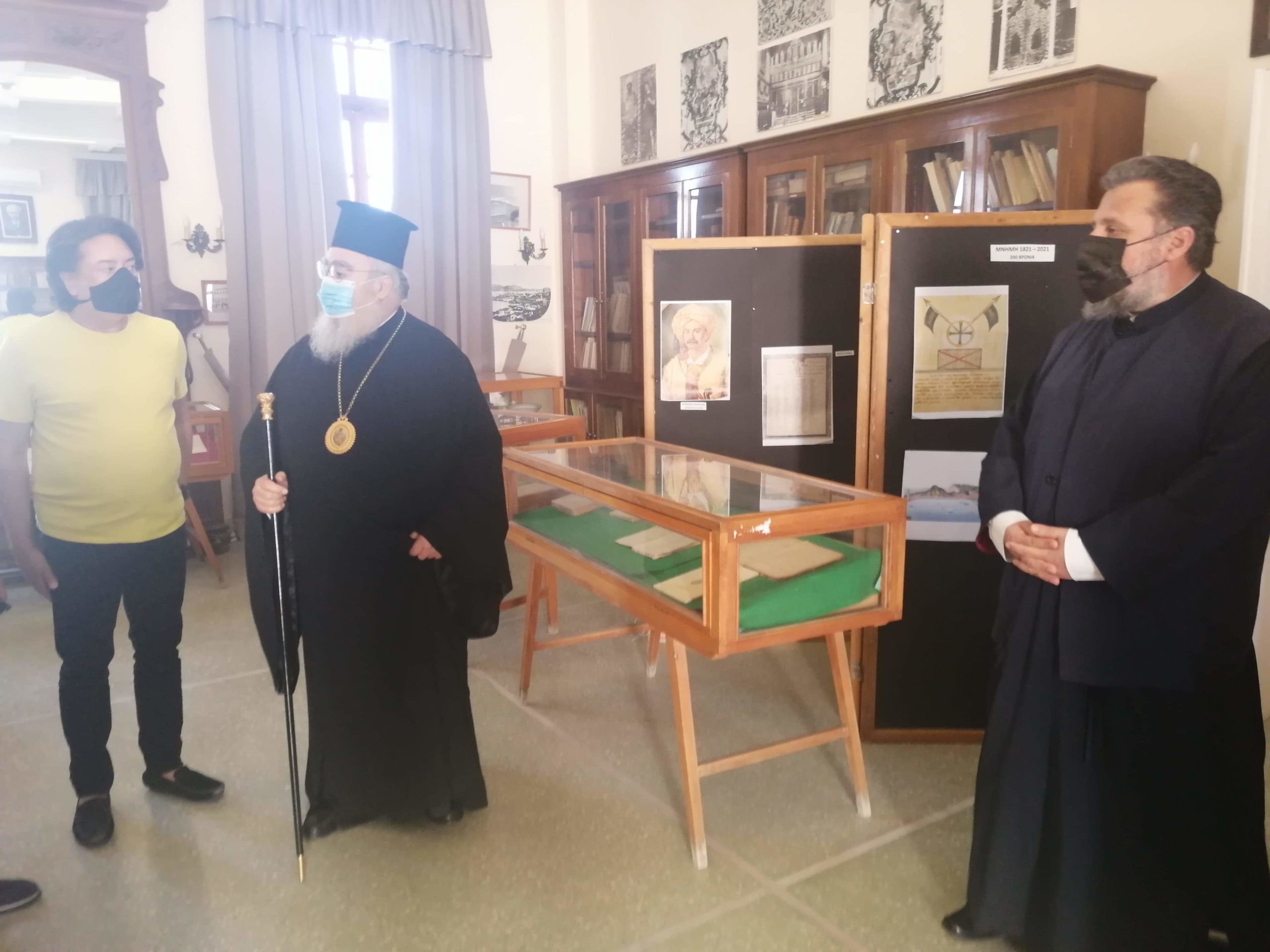 Τους δύο Μητροπολίτες υποδέχτηκε στην είσοδο της Βιβλιοθήκης ο Πρόεδρος του Εφορευτικού Συμβουλίου Φ. Συνετός, ο οποίος μαζί με τους υπαλλήλους  ξενάγησε τους καλεσμένους στην έκθεση που έχει οργανωθεί για τα 200 χρόνια από την Ελληνική Επανάσταση, στο αναγνωστήριο που πρόσφατα επαναλειτούργησε, αλλά και στο Παιδικό Τμήμα της Βιβλιοθήκης στο οποίο υπήρχε ήδη μια μικρή επισκέπτης!