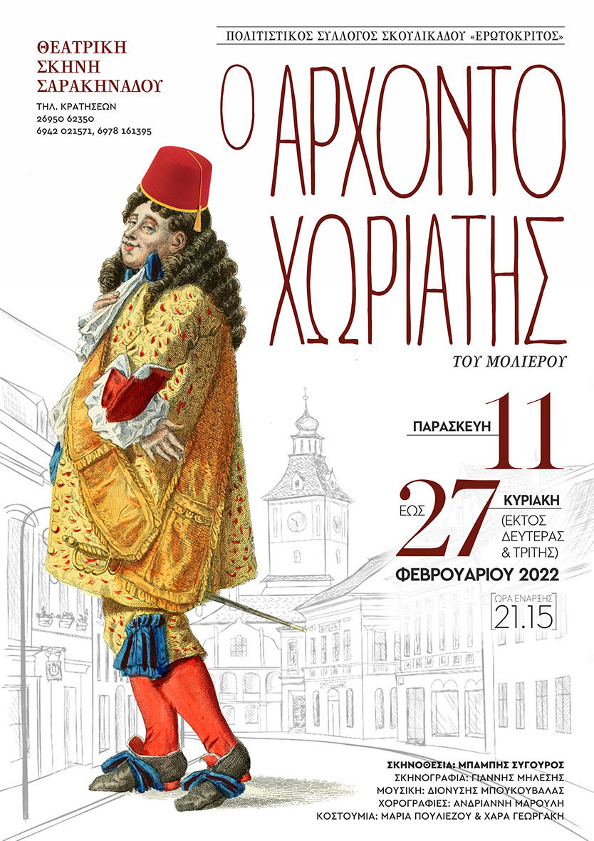 Σας ανακοινώνουμε ότι ο Πολιτιστικός Σύλλογος Σκουλικάδου “Ο Ερωτόκριτος” θα παρουσιάσει την θεατρική παράσταση “Αρχοντοχωριάτης” του Μολιέρου από Παρασκευή 11 Φλεβάρη 2022 έως Κυριακή 27 Φλεβάρη 2022, εκτός Δευτέρας και Τρίτης, στη θεατρική σκηνή του Σαρακηνάδου. Ώρα έναρξης παραστάσεων 21.15