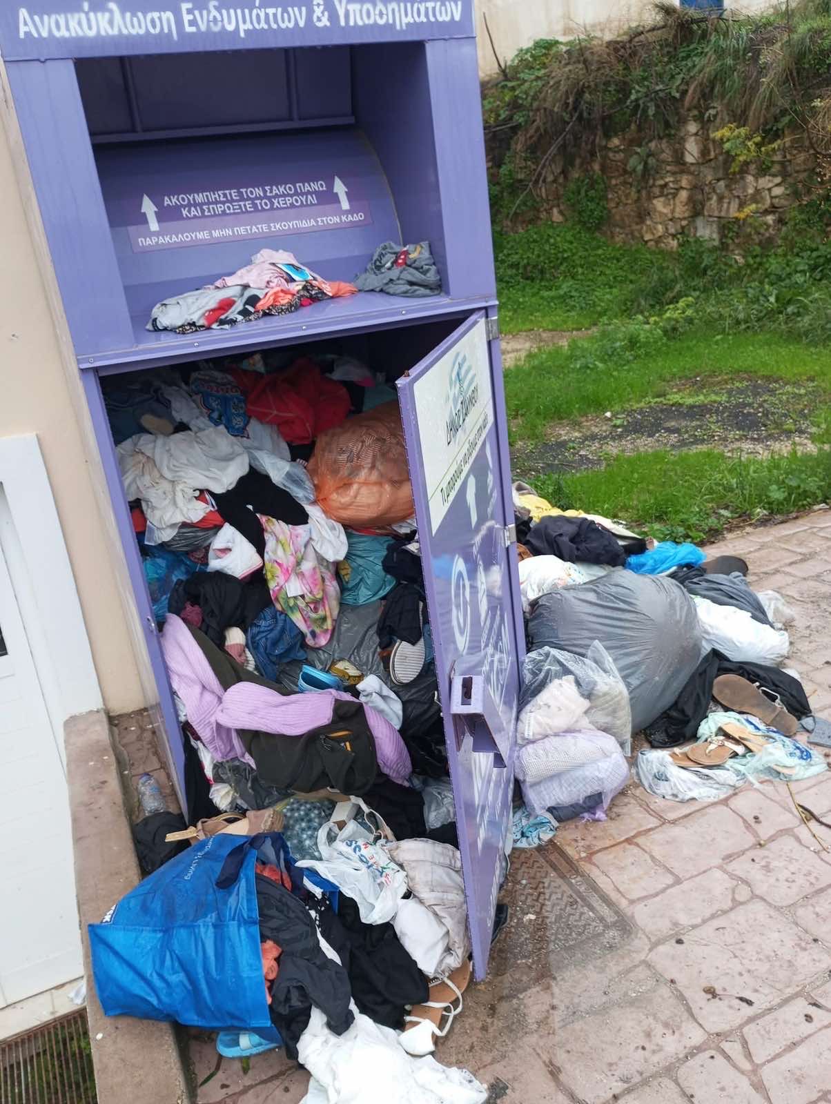 Σύμφωνα με κατοίκους της περιοχής, ο κάδος ήταν γεμάτος ήδη από το καλοκαίρι. Παρά τις συνεχείς προσπάθειες πολιτών να αφήσουν ρούχα για ανακύκλωση ή προσφορά, ο χώρος του κάδου δεν επαρκούσε. Έτσι, πολλοί άφησαν σακούλες και κουτιά με ρούχα γύρω από τον κάδο, με αποτέλεσμα να συσσωρευτεί ένα μικρό ‘’βουνό’’ από αντικείμενα στον περίγυρο. Όταν η πόρτα του κάδου άνοιξε από το βάρος, τα ρούχα κατέληξαν διάσπαρτα στο έδαφος, σε κατάσταση εγκατάλειψης.