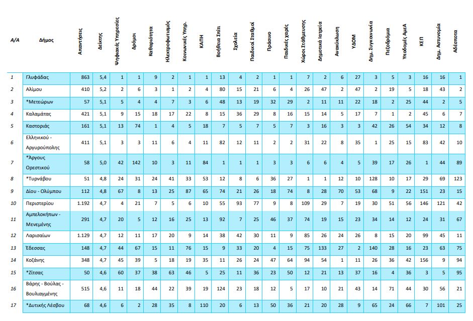 “Κορυφαίος” δήμος είναι αυτός της Γλυφάδας αλλά με βαθμολογία μόλις 5,4 στα 10 (δηλαδή, λίγο πάνω από τη βάση), δεύτερος ο Δήμος Αλίμου (5,2) και στην τρίτη θέση, οριακά πάνω από τη βάση (5,1), ισοβαθμούν οι Δήμοι Μετεώρων, Καλαμάτας, Καστοριάς και Ελληνικού-Αργυρούπολης.