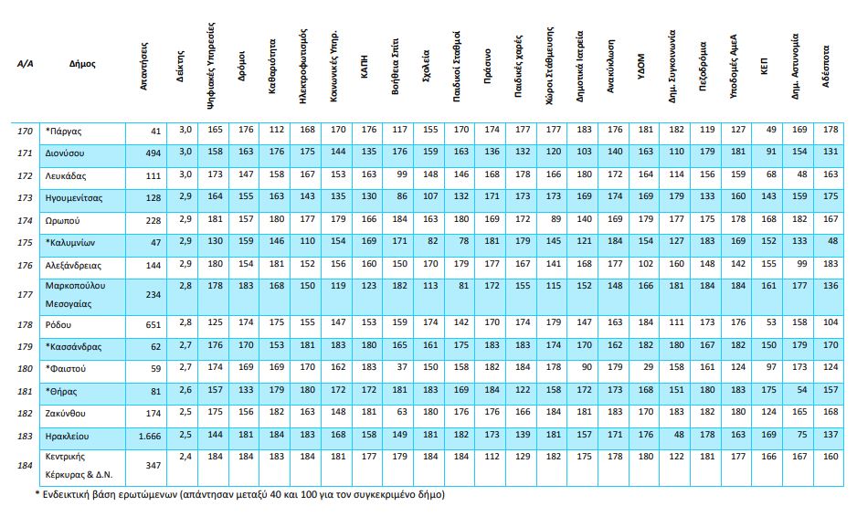 Στις τελευταίες θέσεις με βαθμολογίες μικρότερες του 2,9 στα 10 βρίσκονται (λόγω ισοβαθμίας) 12 δήμοι: Ηγουμενίτσας, Ωρωπού, Καλυμνίων, Αλεξάνδρειας (2,9), Μαρκοπούλου – Μεσογαίας, Ρόδου (2,8), Κασσάνδρας, Φαιστού με 2,7, Θήρας (2,6), Ζακύνθου, Ηρακλείου (2,5) και τελευταίος με 2,4 ο Δήμος Κεντρικής Κέρκυρας.