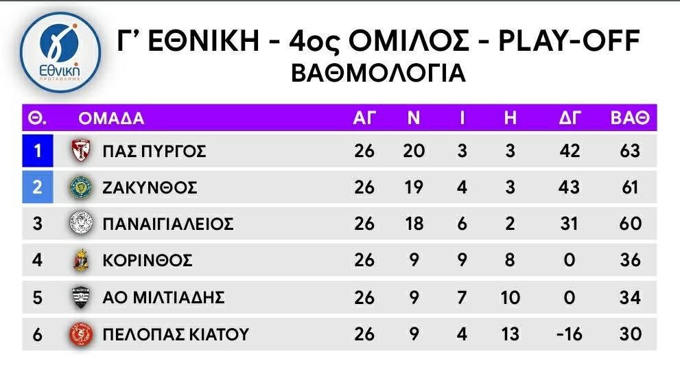 Την ίδια ώρα ο Πύργος με 63 βαθμούς είναι στην κορυφή της βαθμολογίας και είναι σίγουρα στα μπαράζ ανόδου.