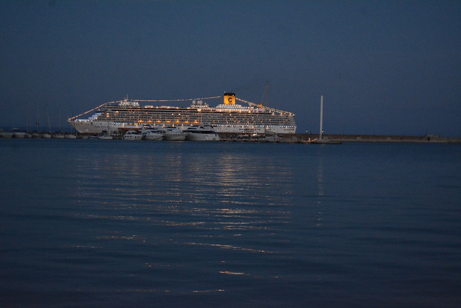 Η εικόνα ήταν εντυπωσιακή και συνάμα μαγευτική το σούρουπο στο λιμάνι με το πολυτελές πλοίο φωταγωγημένο να ετοιμάζεται για τον απόπλου.