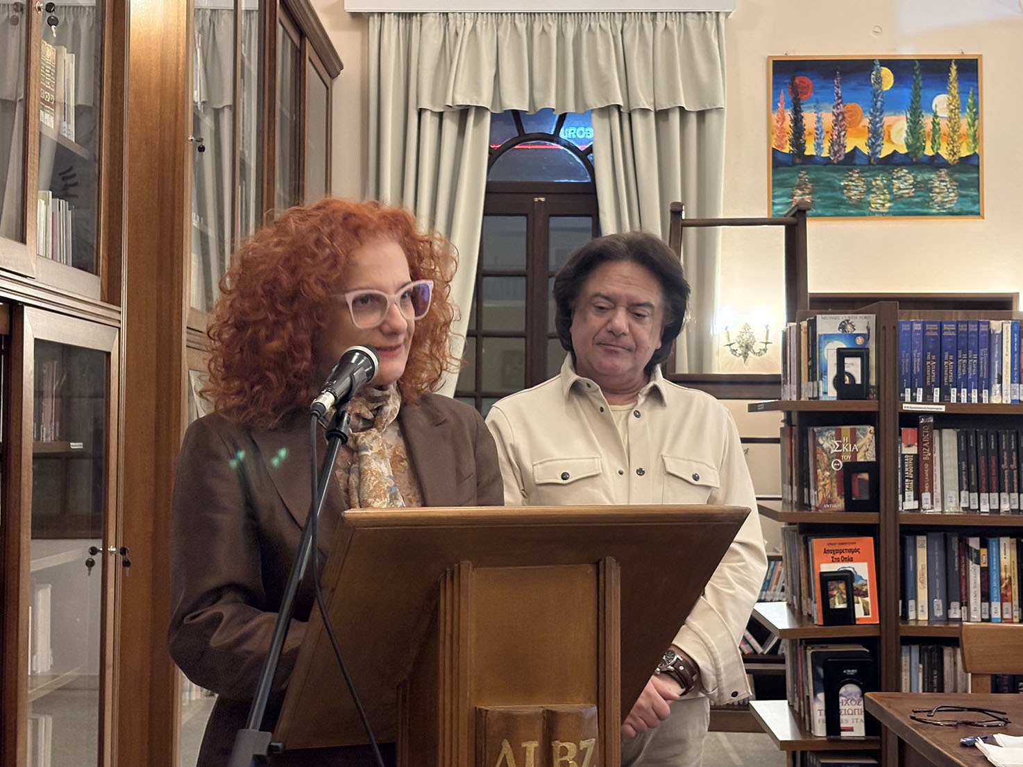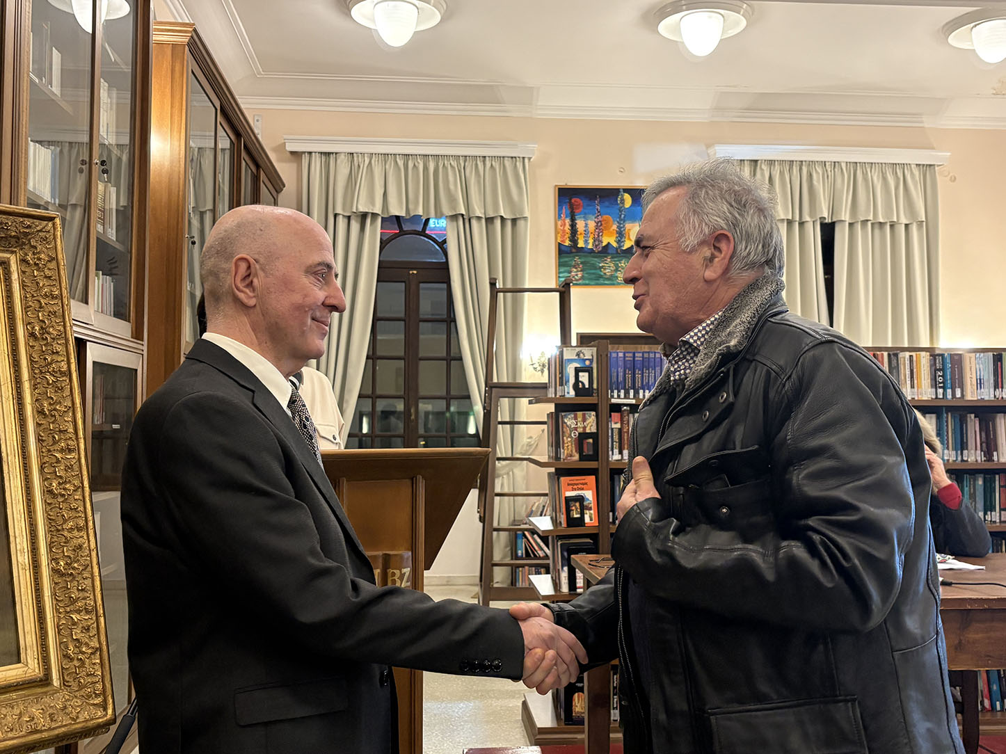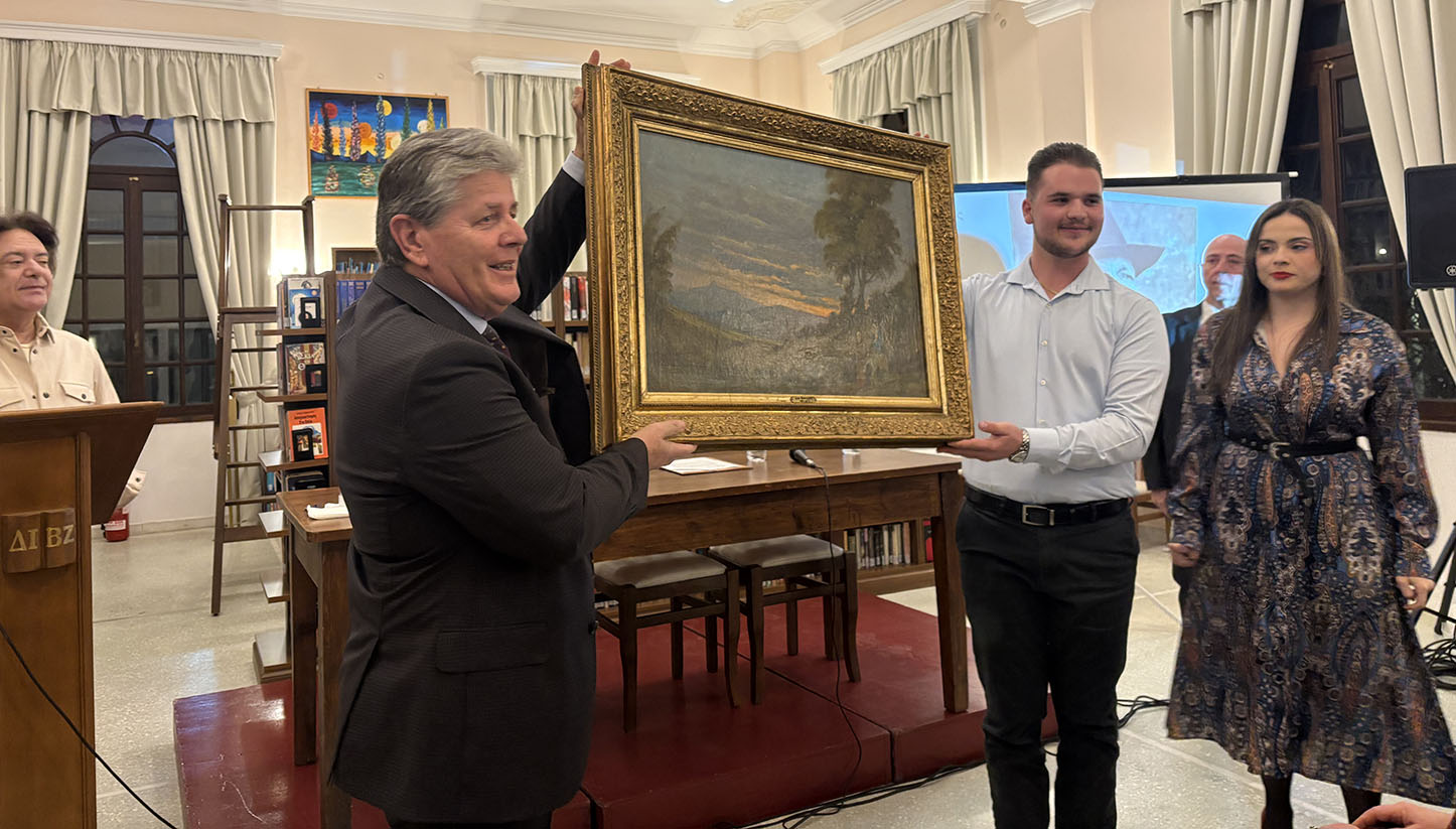 Η βραδιά ξεκίνησε με ομιλία του προϊσταμένου της Βιβλιοθήκης Γιάννη Μαρίνου, ο οποίος αναφέρθηκε στο ιστορικό της πρωτοβουλία της δωρεάς του κ. Χ. Μάνεση. Στη συνέχεια ο κ.Χαρ. Μάνεσης, συνοδευόμενος από δύο νέους παρέδωσε το έργο στον πρόεδρο της Βιβλιοθήκης κ. Φίλιππο Συνετό, έργο που στη συνέχεια τοποθετήθηκε προσωρινά σε ειδικό καβαλέτο της Βιβλιοθήκης.