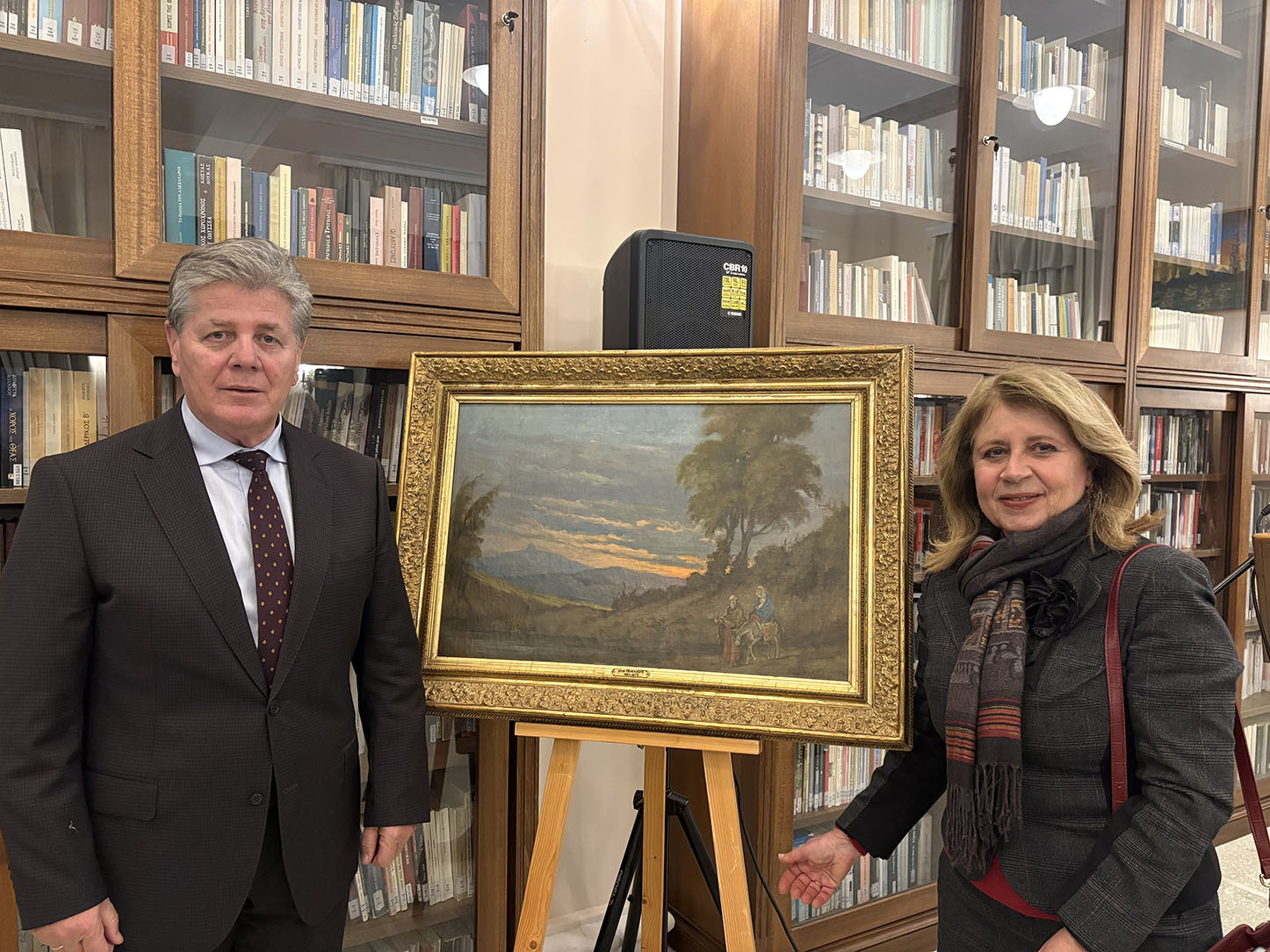 Αμέσως μετά την υπογραφή του σχετικού πρωτοκόλλου παράδοσης και παραλαβής μίλησε ο κ. Χαρ. Μάνεσης για τους λόγους που τον οδήγησαν στη δωρεά του συγκεκριμένου έργου στην Βιβλιοθήκη και για τη σχέση που μπορεί να έχει αυτό το έργο με την νέα γενιά σε ένα χώρο απολύτως πνευματικό, όπως είπε. Είναι η “φυγή του θείου βρέφους και της Αγίας Οικογένειας από την Βηθλεέμ στην Αίγυπτο” λίγο πριν τις σφαγές των νηπίων από το βασιλιά Ηρώδη, σε ένα τοπίο που έχει τα χαρακτηριστικά της ζακυνθινής φύσης, με το βουνό του Σκοπού στο βάθος.