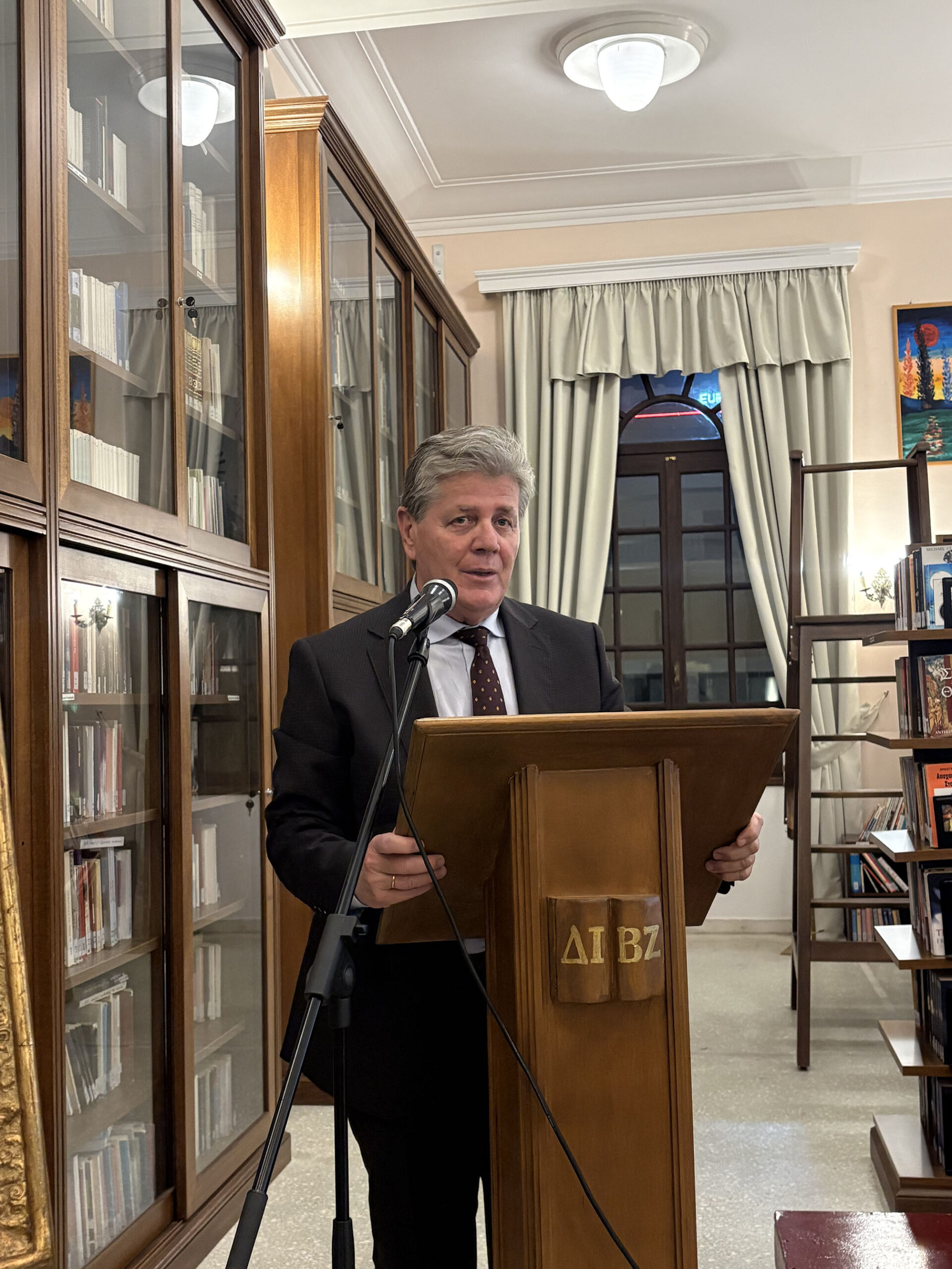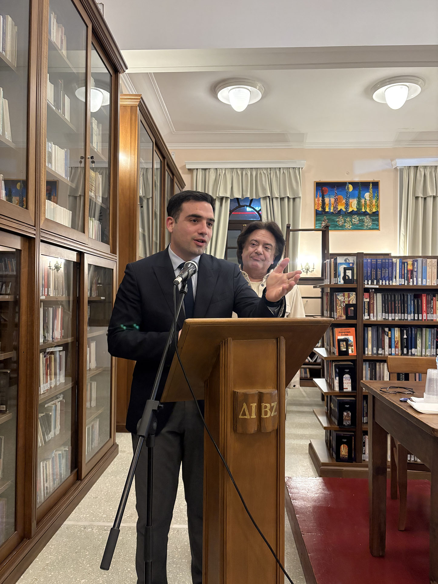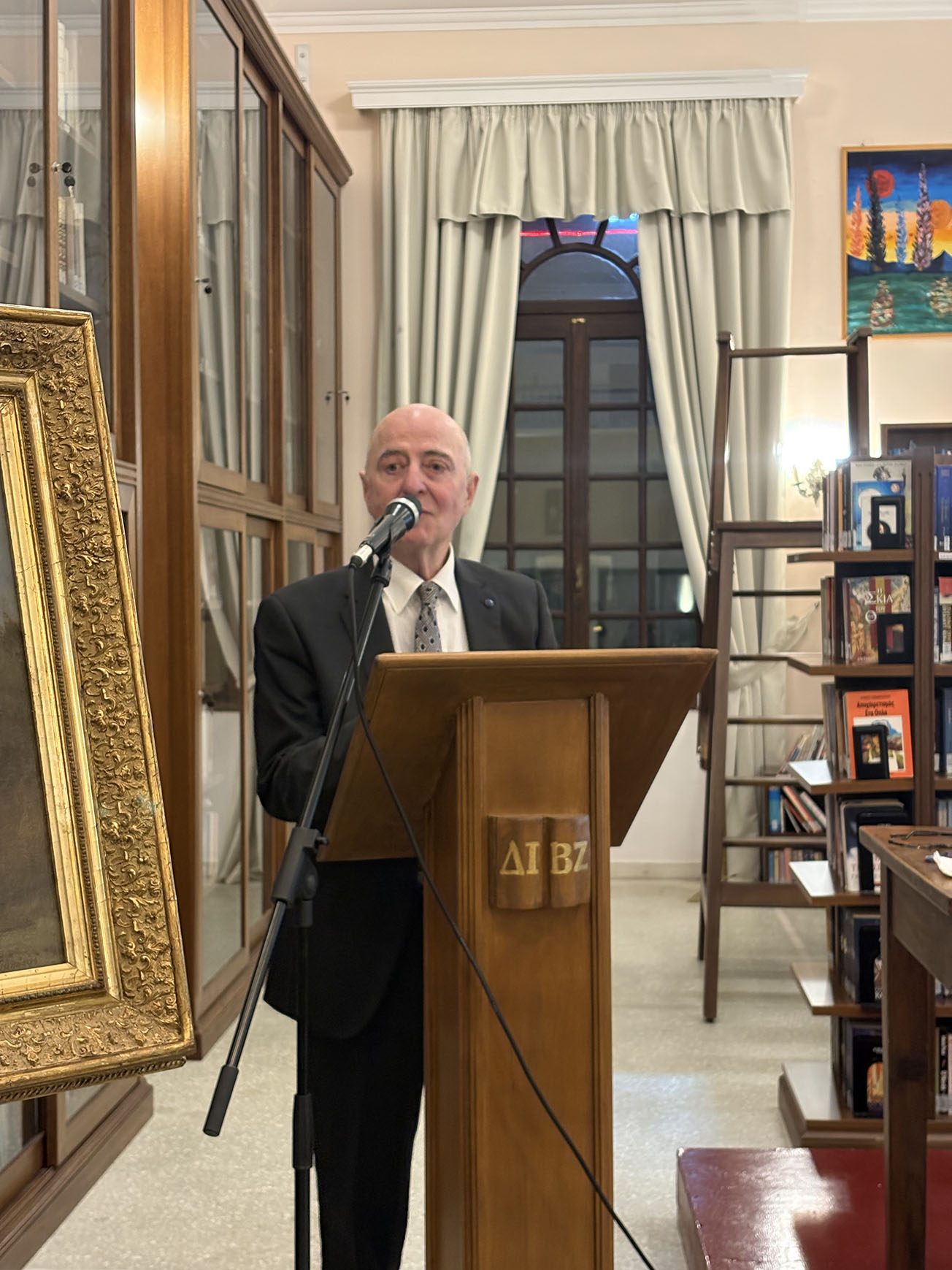 Μίλησε με θερμά λόγια για την αξία του έργου των Σπύρου και Δημητρίου Πελεκάση ως εκπροσώπων της επτανησιακής σχολής και δεσμεύτηκε σύντομα να δωρήσει ένα έργο του Σπυρίδωνα Πελεκάση στην Βιβλιοθήκη για να συμπληρωθεί, όπως είπε, η ιστορική συμβολή της οικογένειας των Πελεκάσηδων στην τέχνη στον συγκεκριμένο χώρο.